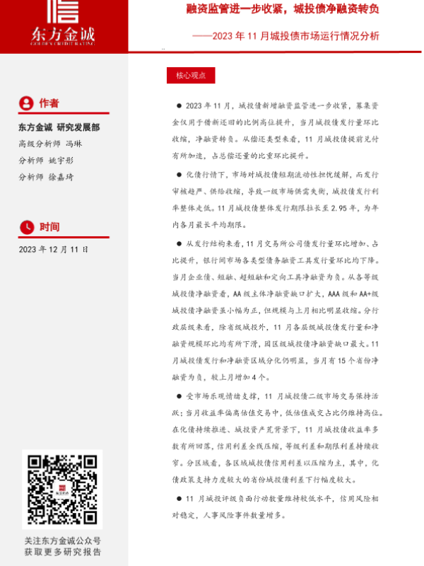 【东方金诚】【20231211】融资监管进一步收紧,城投债净融资转负——2023年11月城投债市场月报-33页
