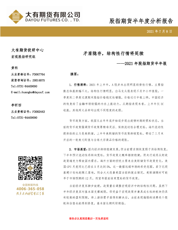 【大有期货】【20210708】2021年股指期货半年报:矛盾隐存,结构性行情将延续-15页