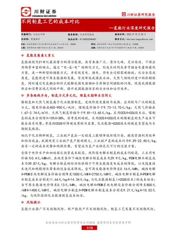 【川财证券】【20221020】氢能行业深度研究报告:不同制氢工艺的成本对比-19页