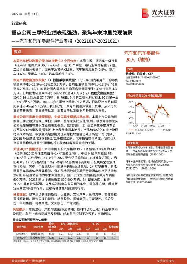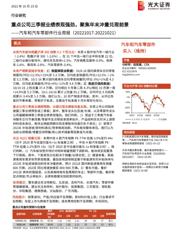 【光大证券】【20221023】汽车和汽车零部件行业周报:重点公司三季报业绩表现强劲,聚焦年末冲量兑现前景-21页