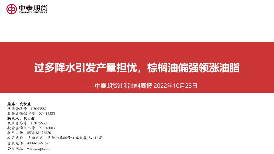 【中泰期货】【20221023】油脂油料周报:过多降水引发产量担忧,棕榈油偏强领涨油脂-55页