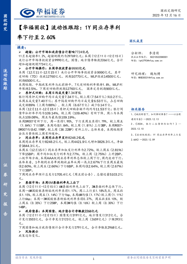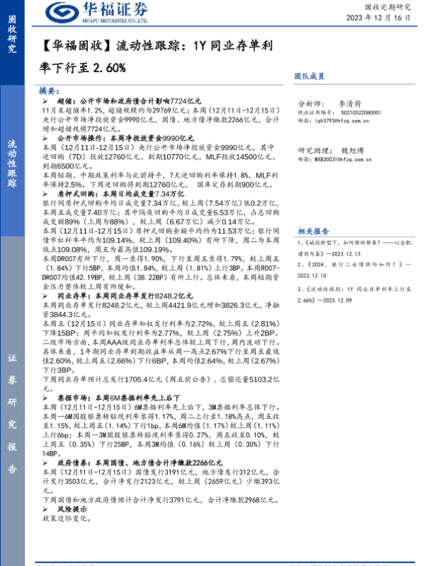 【华福证券】【20231216】【华福固收】流动性跟踪:1Y同业存单利率下行至2.60%-12页