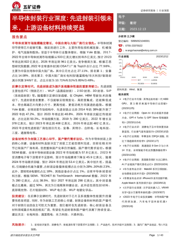 【五矿证券】【20231213】五矿证券:半导体封装行业深度-先进封装引领未来-上游设备材料持续受益-42页