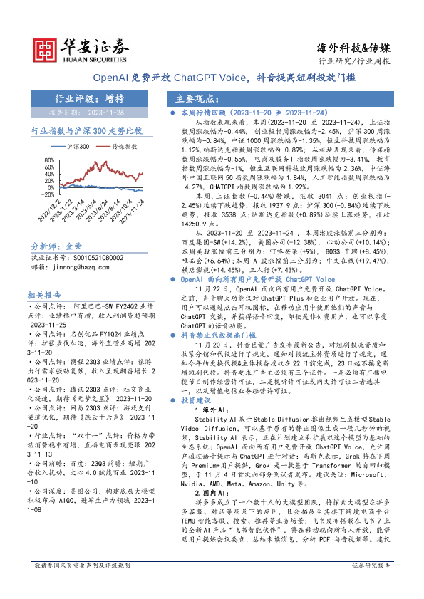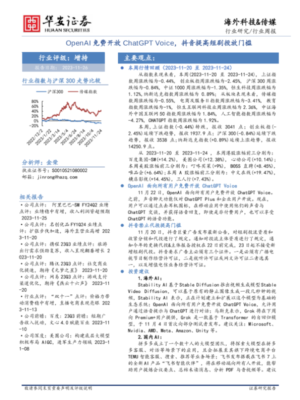 【华安证券】【20231126】OpenAI免费开放ChatGPT+Voice,抖音提高短剧投放门槛-35页