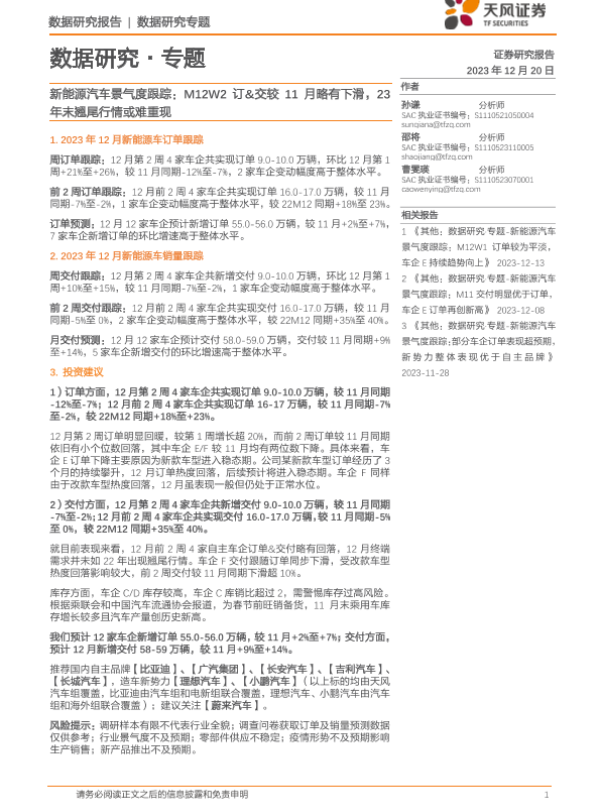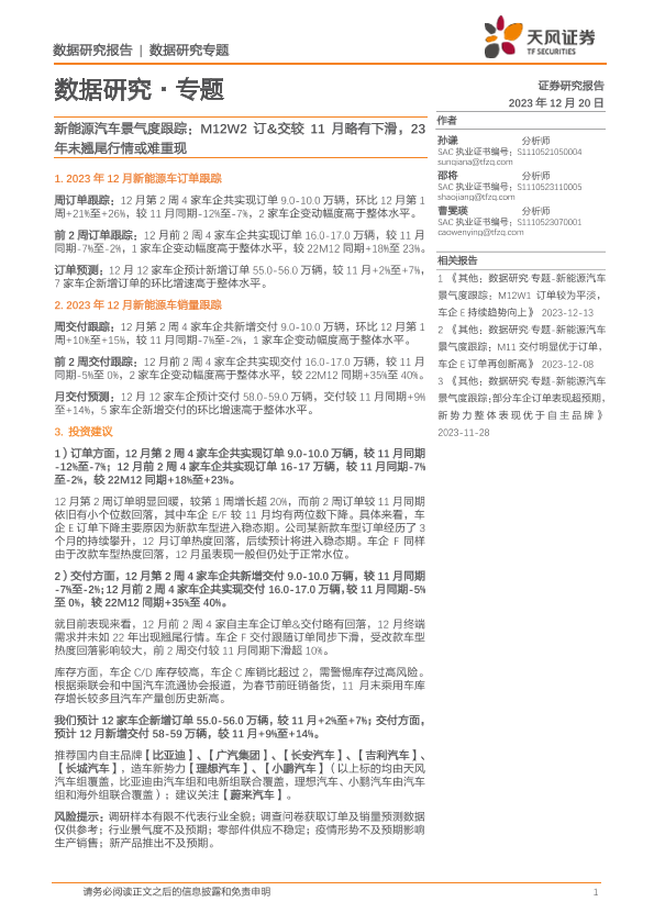 【天风证券】【20231220】新能源汽车景气度跟踪:M12W2订&交较11月略有下滑,23年末翘尾行情或难重现-12页