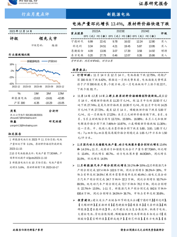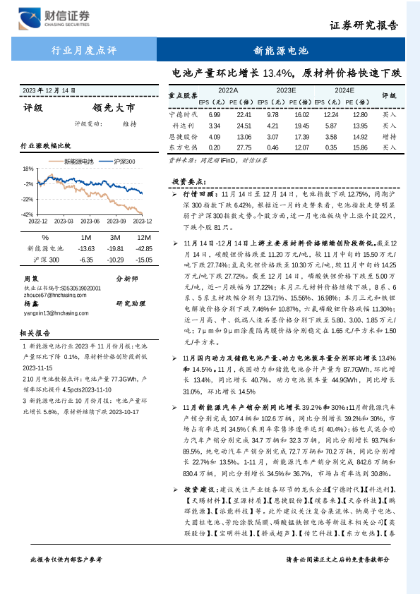 【财信证券】【20231214】新能源电池行业月度点评:电池产量环比增长13.4%,原材料价格快速下跌-12页
