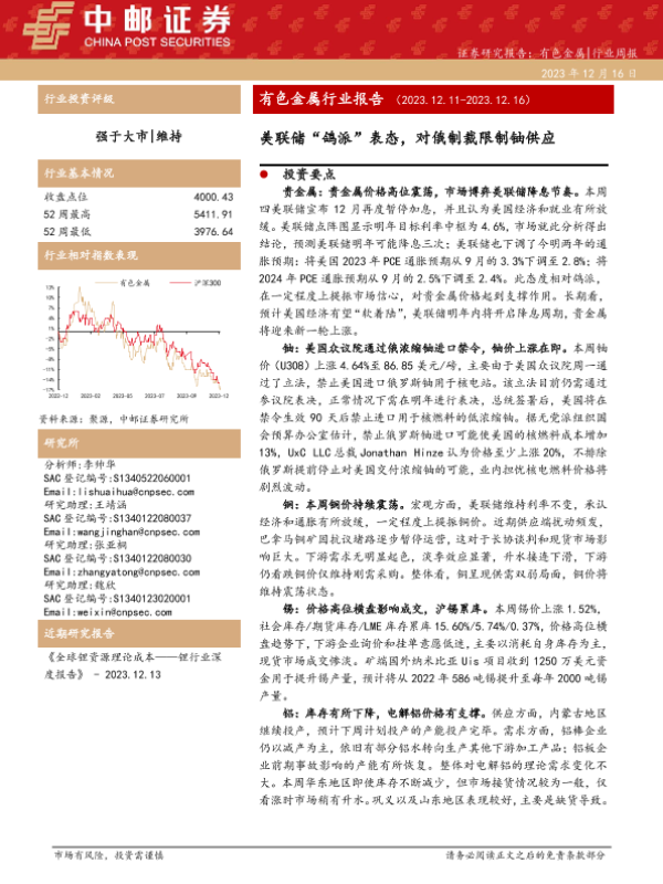 【中邮证券】【20231216】有色金属行业报告:美联储“鸽派”表态,对俄制裁限制铀供应-15页