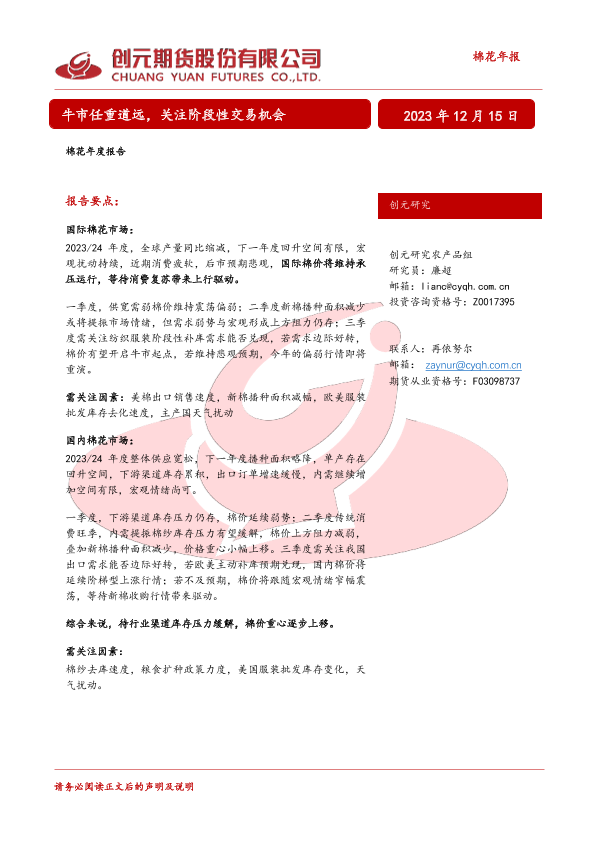 【创元期货】【20231215】棉花年报:牛市任重道远,关注阶段性交易机会-26页