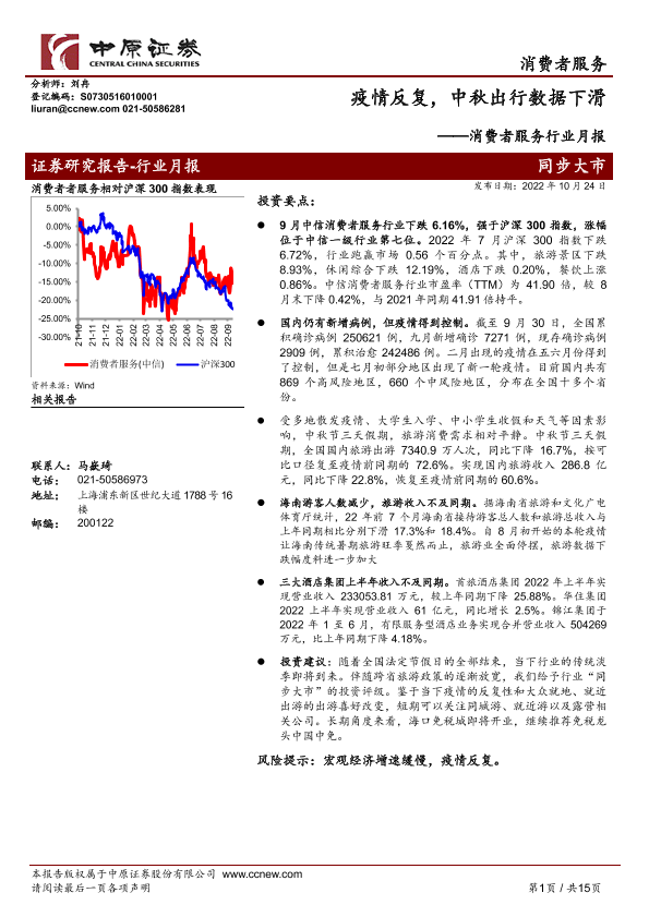 【中原证券】【20221024】消费者服务行业月报:疫情反复,中秋出行数据下滑-15页