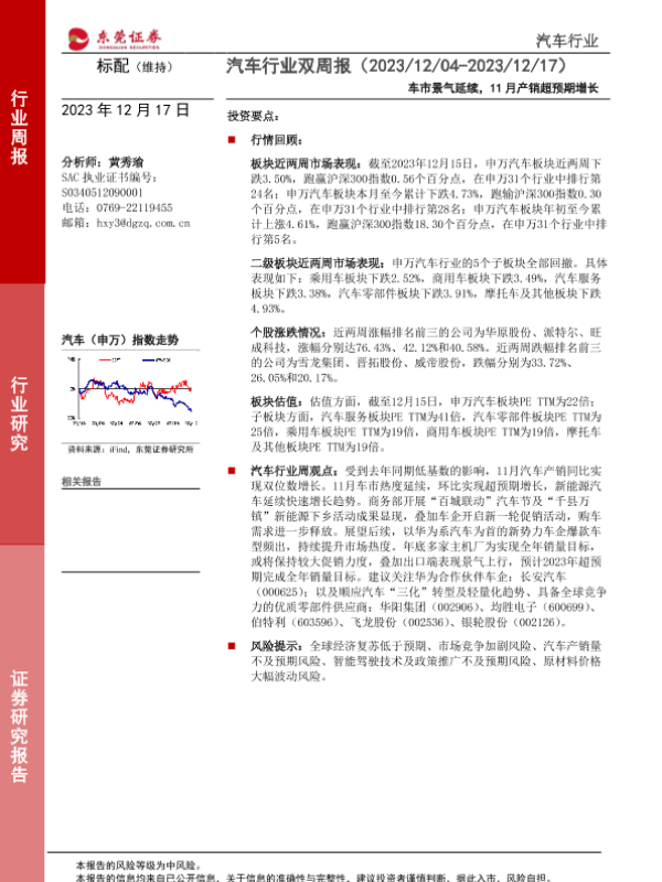 【东莞证券】【20231217】汽车行业双周报:车市景气延续,11月产销超预期增长-11页