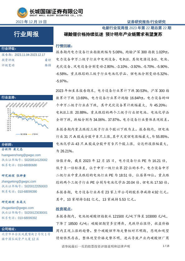 【长城国瑞证券】【20231219】电新行业双周报2023年第22期总第22期:碳酸锂价格持续低迷 预计明年产业链需求有望复苏-16页