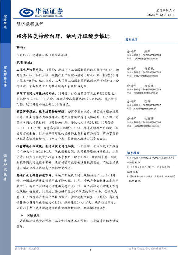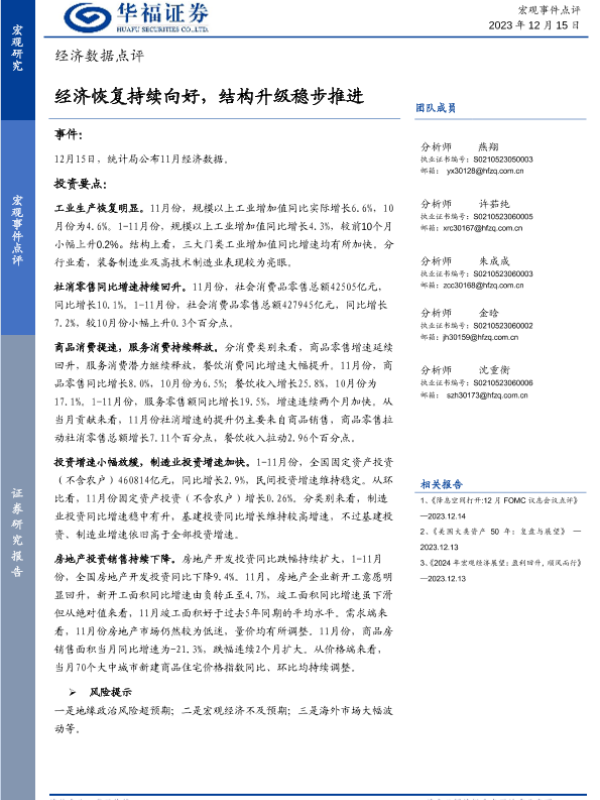 【华福证券】【20231215】经济数据点评:经济行业名恢复持续向好,结构升级稳步推进-11页