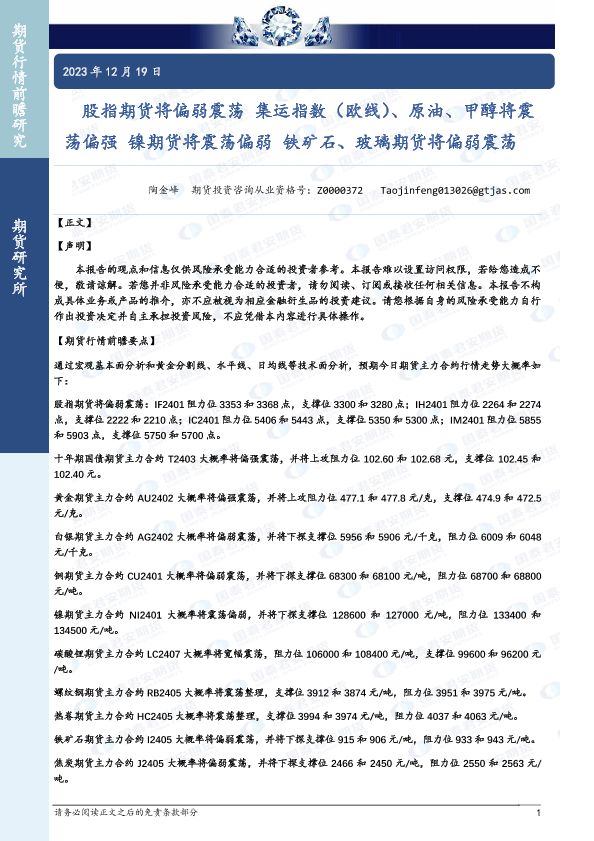 【国泰君安期货】【20231219】股指期货将偏弱震荡 集运指数(欧线)、原油、甲醇将震荡偏强 镍期货将震荡偏弱 铁矿石、玻璃期货将偏弱震荡-35页