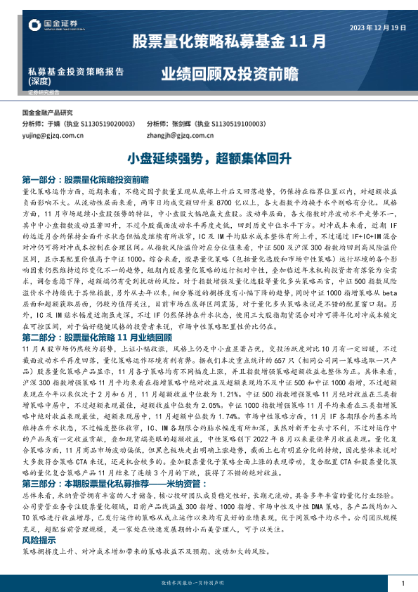 【国金证券】【20231219】股票量化策略私募基金11月业绩回顾及投资前瞻:小盘延续强势,超额集体回升-19页