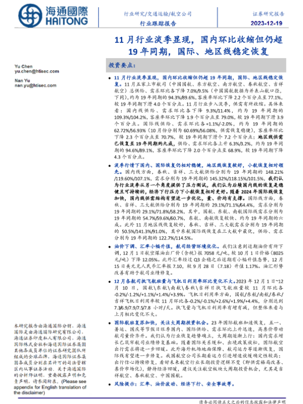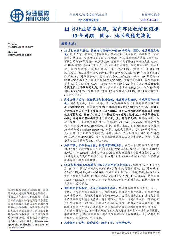 【海通国际】【20231219】航空公司行业跟踪报告:11月行业淡季显现,国内环比收缩但仍超19年同期,国际、地区线稳定恢复-10页
