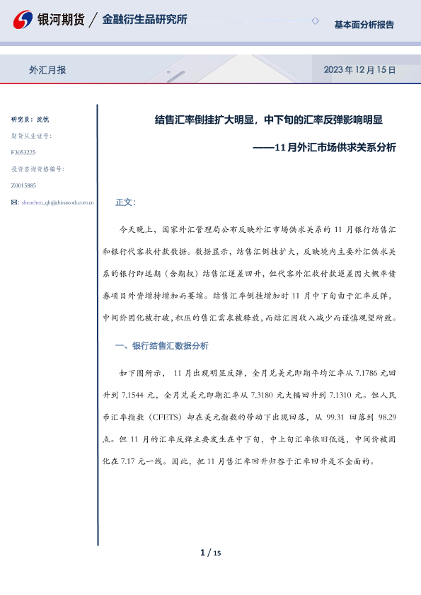 【银河期货】【20231215】11月外汇市场供求关系分析:结售汇率倒挂扩大明显,中下旬的汇率反弹影响明显-15页