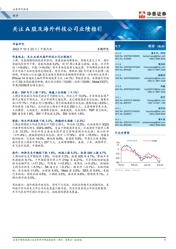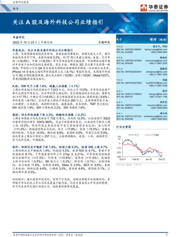 【华泰证券】【20221023】电子行业专题研究: 关注A股及海外科技公司业绩指引-24页