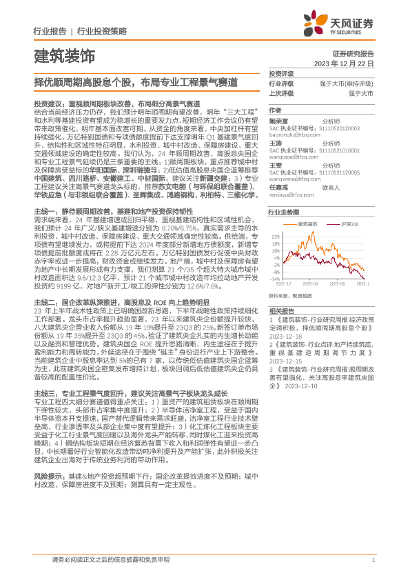 【天风证券】【20231222】建筑装饰:择优顺周期高股息个股,布局专业工程景气赛道-40页