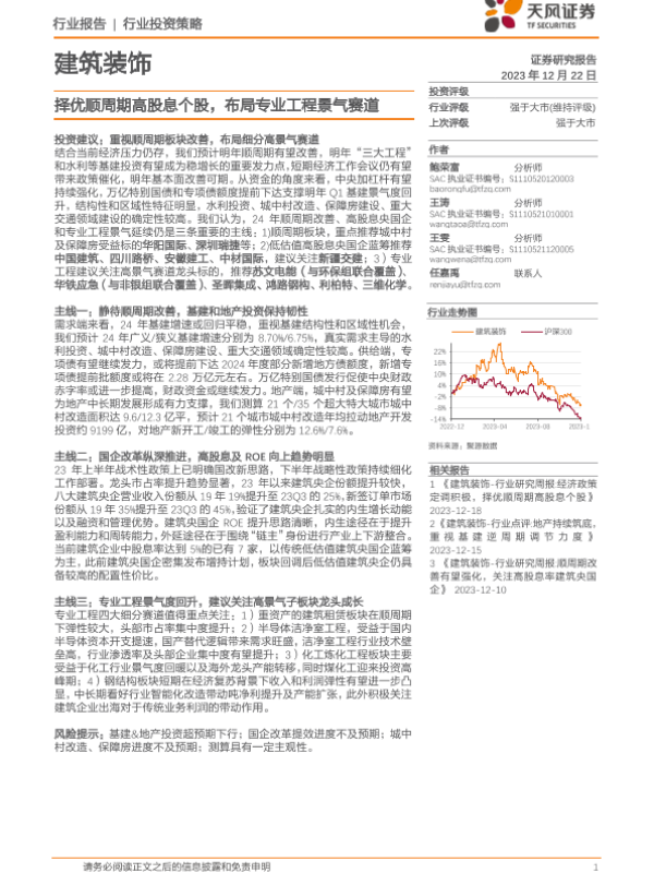 专业工程 建筑装饰 行业投资策略 顺周期 高股息个股