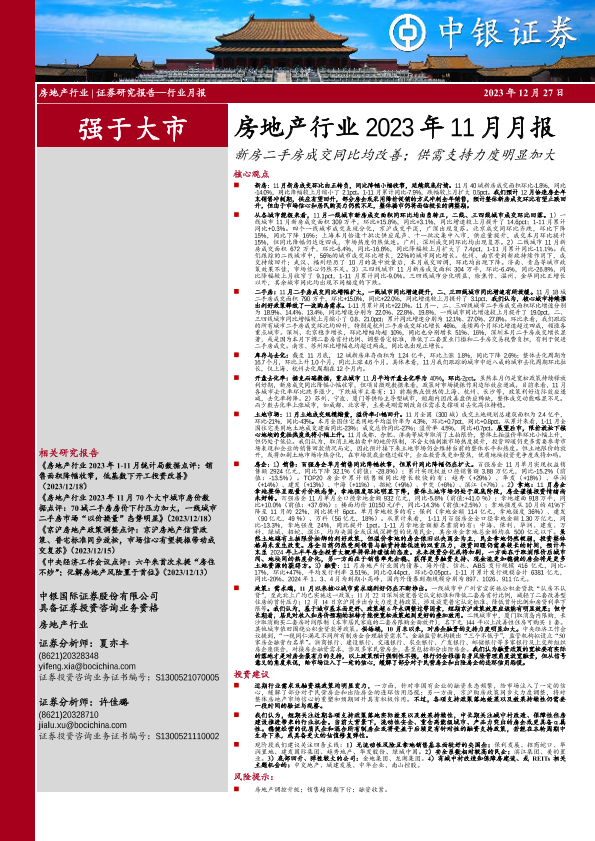 【中银证券】【20231227】房地产行业2023年11月月报:新房二手房成交同比均改善;供需支持力度明显加大-27页