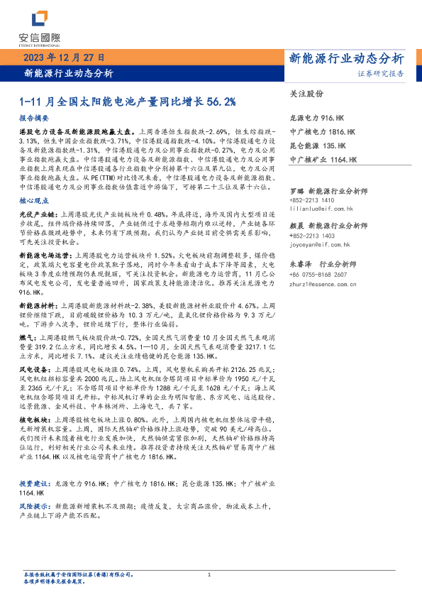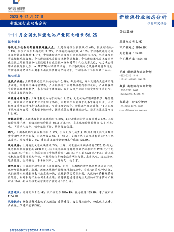【国证国际】【20231227】新能源行业动态分析:1-11月全国太阳能电池产量同比增长56.2%-13页