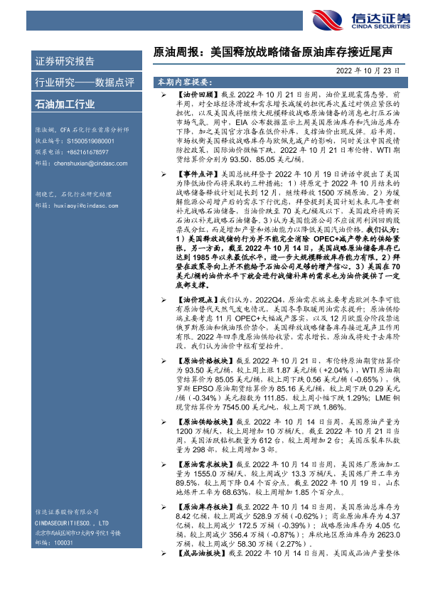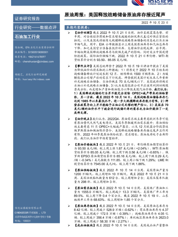 【信达证券】【20221023】石油加工行业原油周报:美国释放战略储备原油库存接近尾声-22页