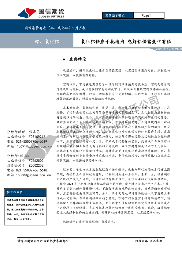 【国信期货】【20231224】有色(铝、氧化铝)1月月报:氧化铝供应干扰迭出 电解铝供需变化有限-22页