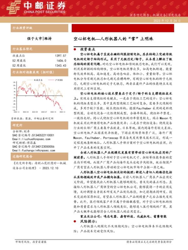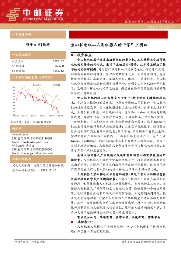 【中邮证券】【20231224】机械设备深度报告:空心杯电机-人形机器人的“掌”上明珠-20页
