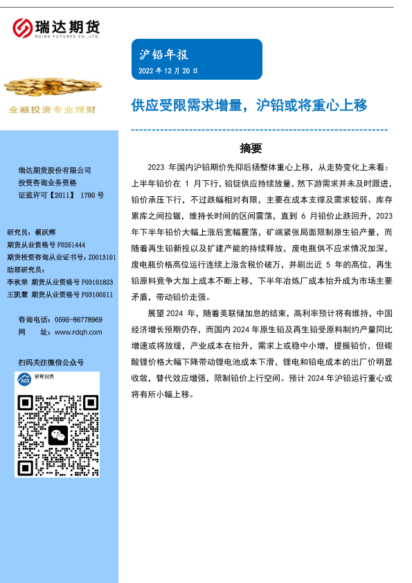 【瑞达期货】【20231220】沪铅年报:供应受限需求增量,沪铅或将重心上移-19页