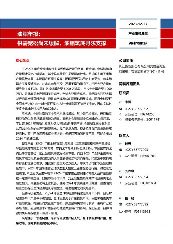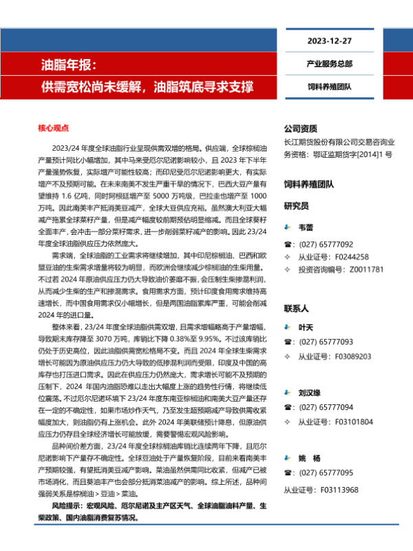 【长江期货】【20231227】油脂年报:供需宽松尚未缓解,油脂筑底寻求支撑-24页