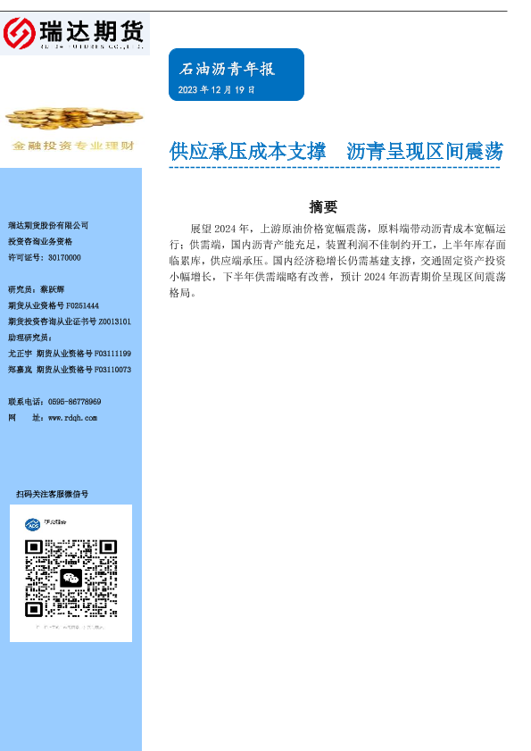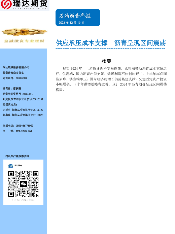 【瑞达期货】【20231219】石油沥青年报:供应承压成本支撑 沥青呈现区间震荡-14页