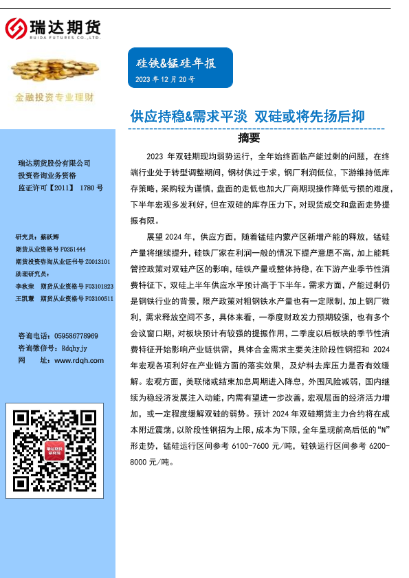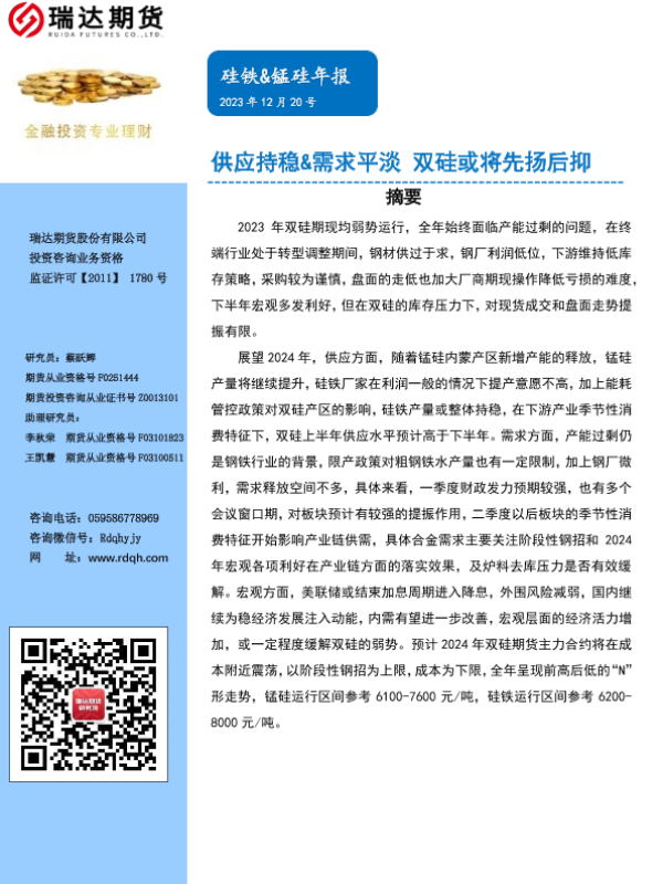 【瑞达期货】【20231220】硅铁&锰硅年报:供应持稳&需求平淡 双硅或将先扬后抑-17页