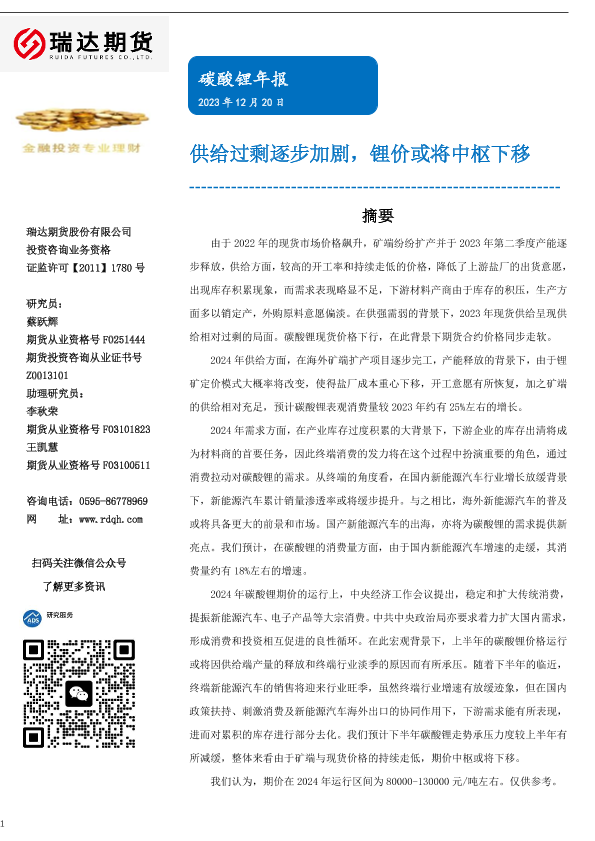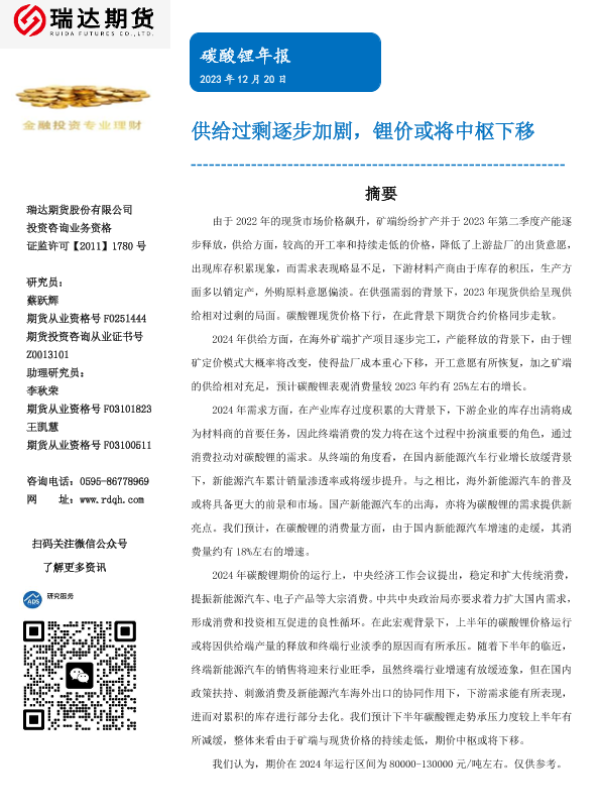 【瑞达期货】【20231220】碳酸锂年报:供给过剩逐步加剧,锂价或将中枢下移-21页