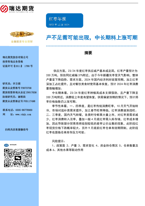【瑞达期货】【20231220】红枣年报:产不足需可能出现,中长期料上涨可期-13页