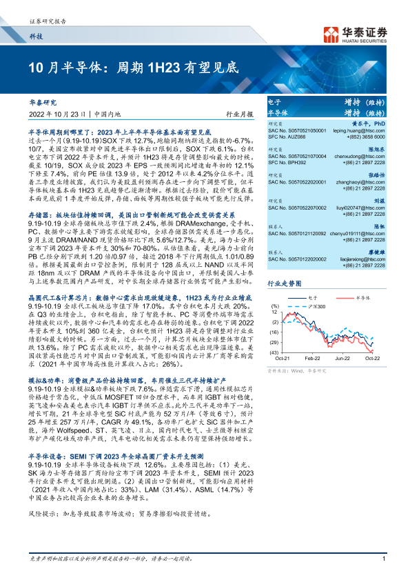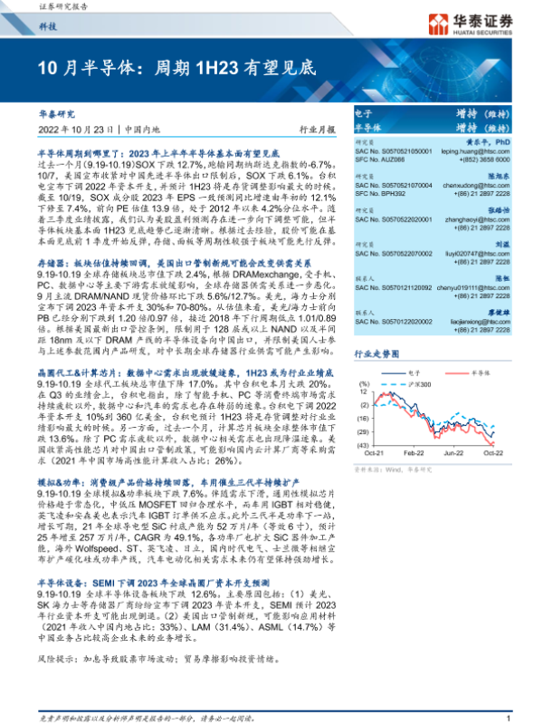【华泰证券】【20221023】科技行业10月半导体:周期1H23有望见底-44页