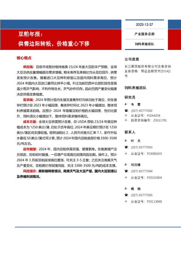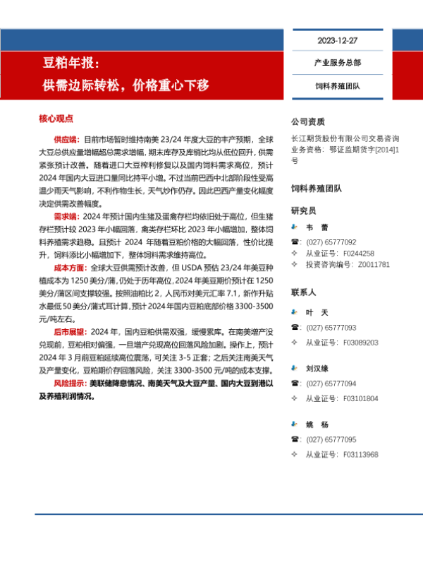 【长江期货】【20231227】豆粕年报:供需边际转松,价格重心下移-16页