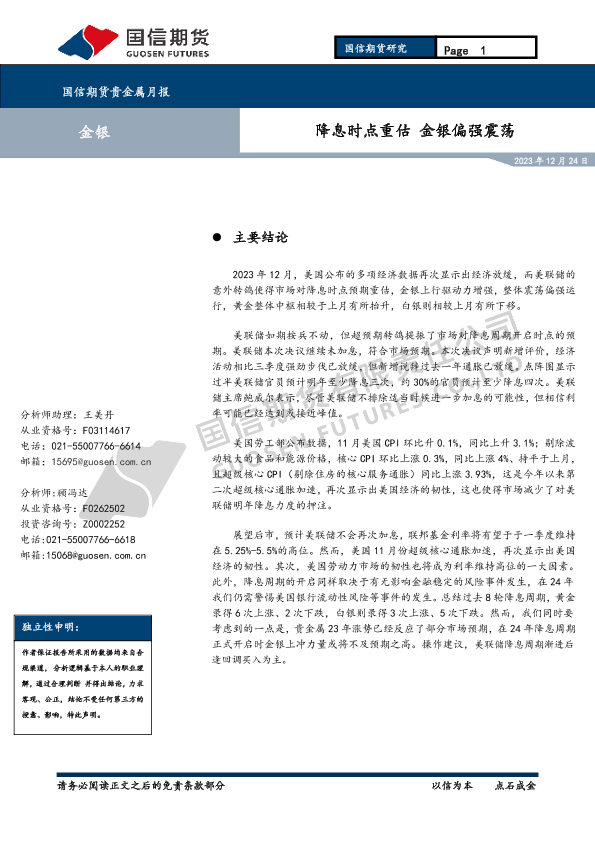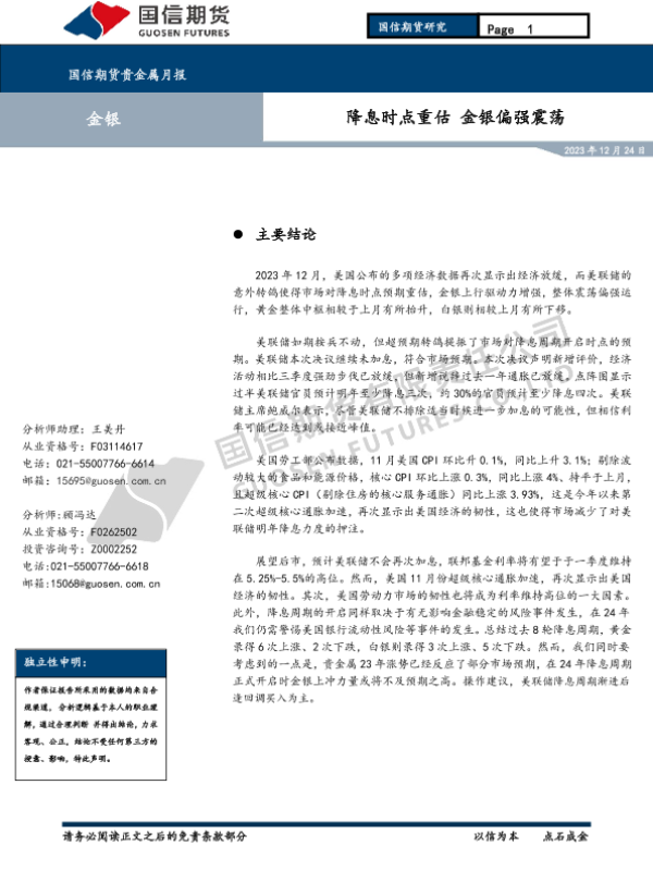 【国信期货】【20231224】贵金属月报:降息时点重估 金银偏强震荡-13页