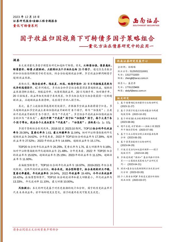 【西南证券】【20231218】量化方法在债券研究中的应用一:因子收益归因视角下可转债多因子策略组合-40页