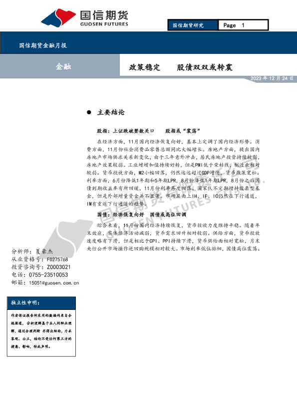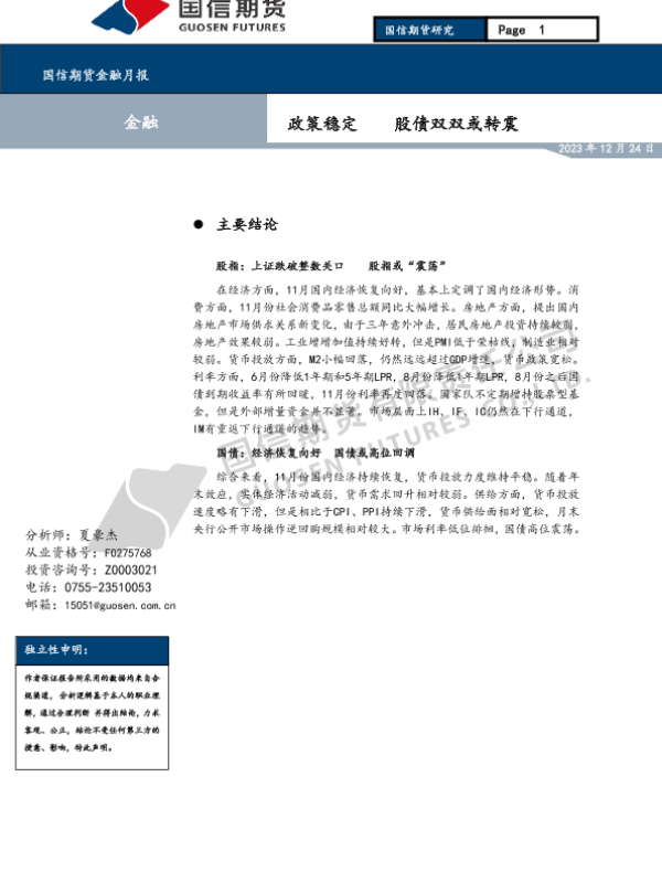 【国信期货】【20231224】金融月报:政策稳定 股债双双或转震-18页