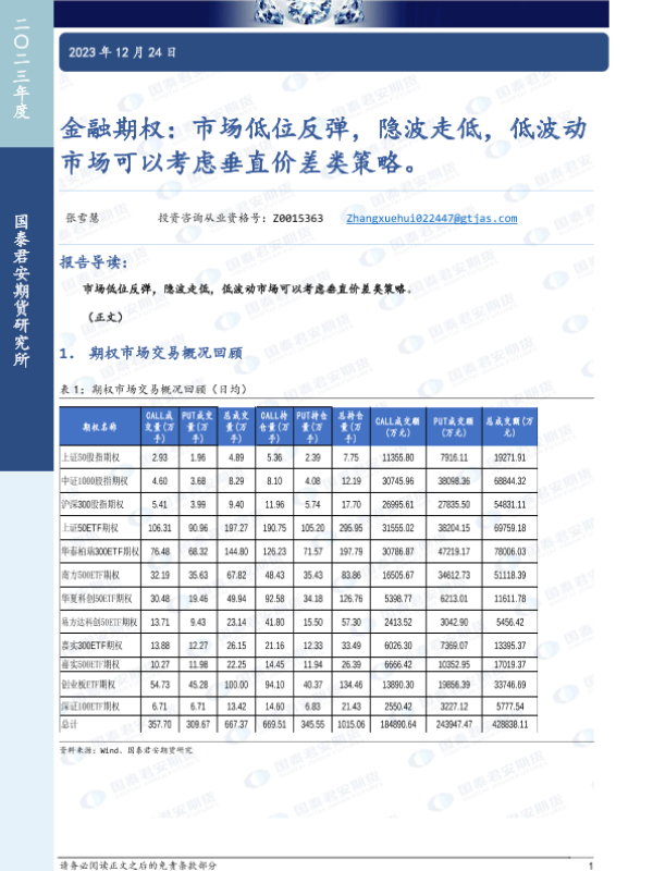 【国泰君安期货】【20231224】金融期权:市场低位反弹,隐波走低,低波动市场可以考虑垂直价差类策略-16页