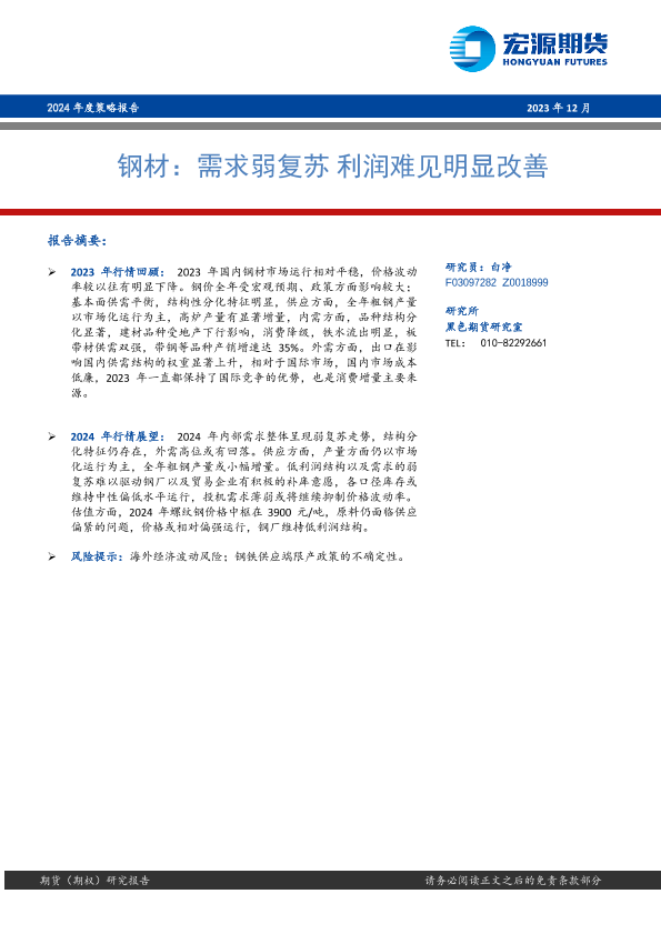 【宏源期货】【20231224】钢材:需求弱复苏 利润难见明显改善-16页