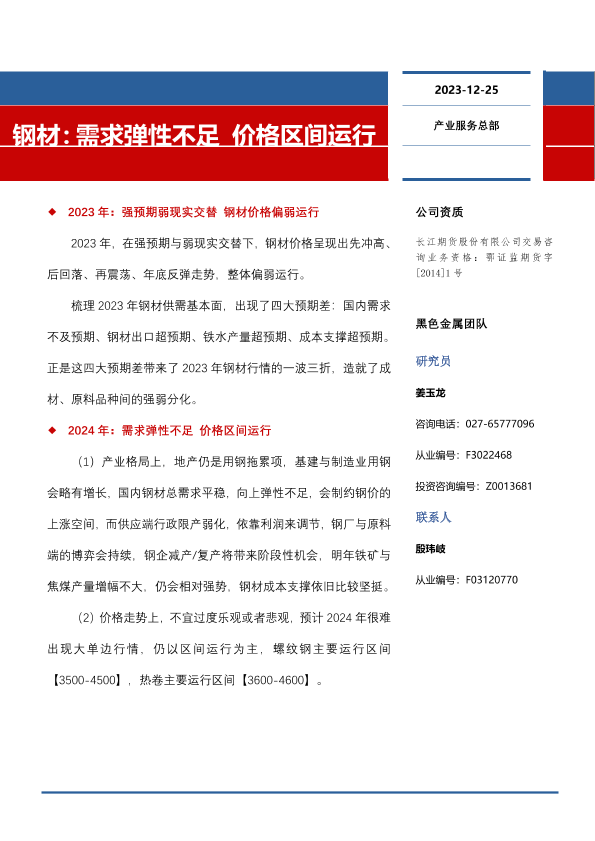 【长江期货】【20231225】钢材:需求弹性不足 价格区间运行-20页