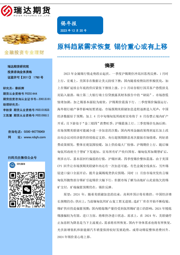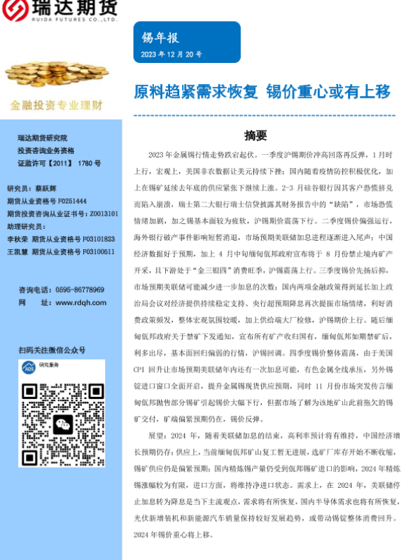 【瑞达期货】【20231220】锡年报:原料趋紧需求恢复 锡价重心或有上移-16页