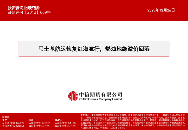 【中信期货】【20231226】马士基航运恢复红海航行,燃油地缘溢价回落-15页