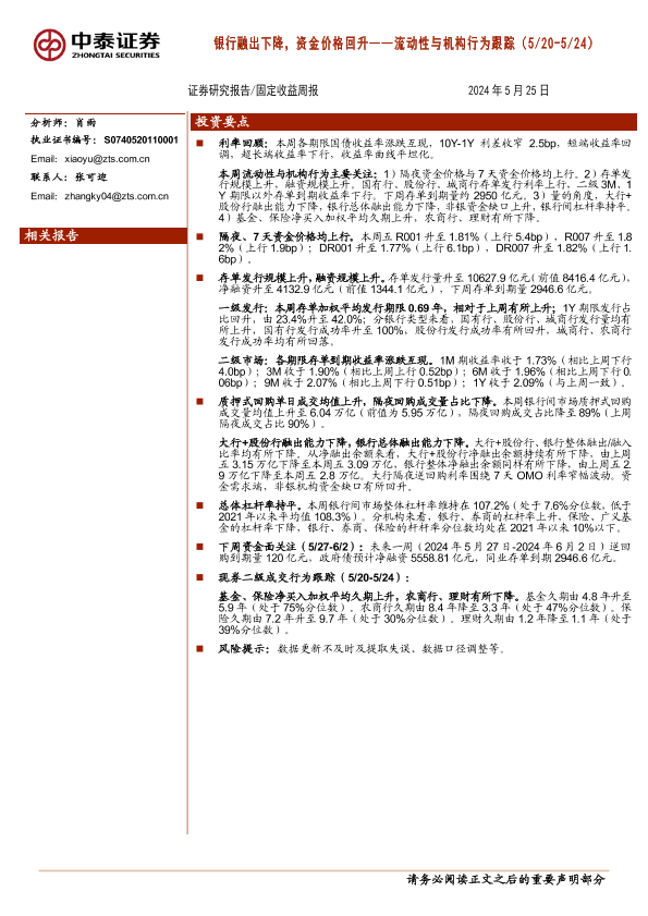 【中泰证券】【20240525】流动性与机构行为跟踪:银行融出下降,资金价格回升-13页