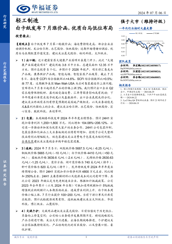 【华福证券】【20240706】轻工制造行业定期报告:白卡纸发布7月涨价函,优质白马低位布局-21页