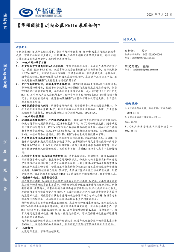 【华福证券】【20240722】【华福固收】近期公募REITs表现如何?-12页