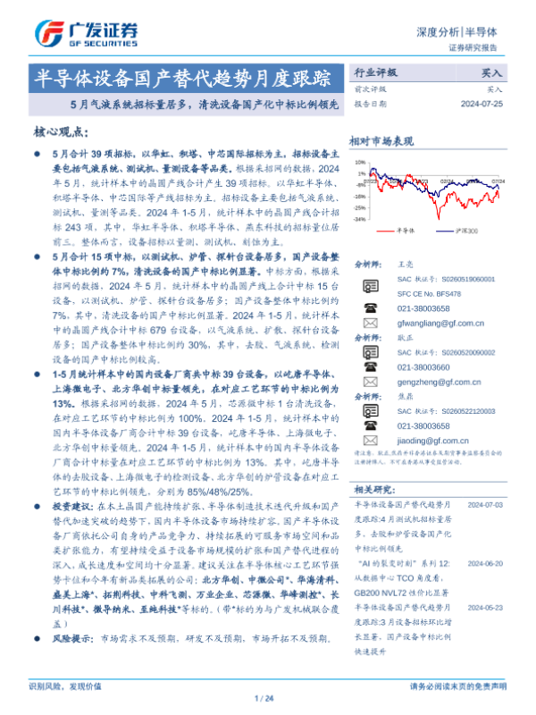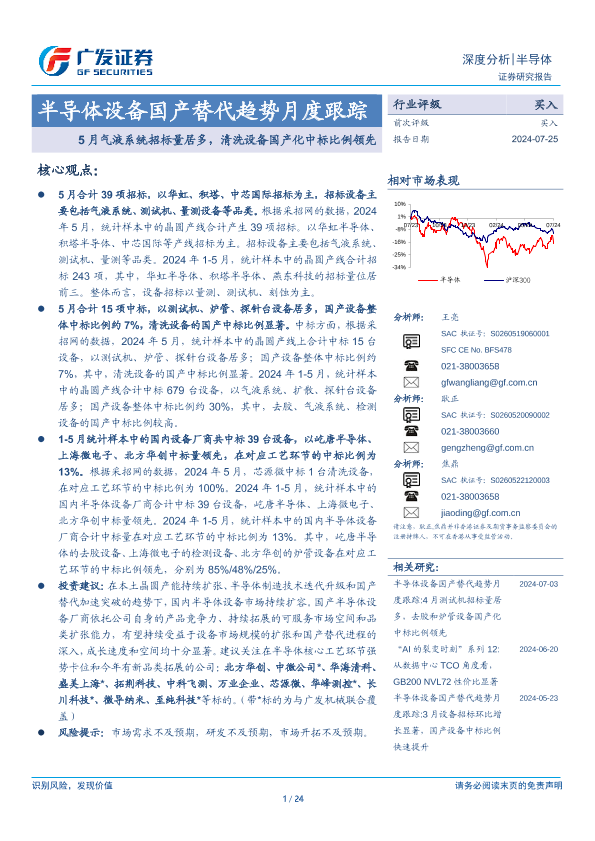 【广发证券】【20240725】半导体设备行业国产替代趋势月度跟踪:5月气液系统招标量居多,清洗设备国产化中标比例领先-24页