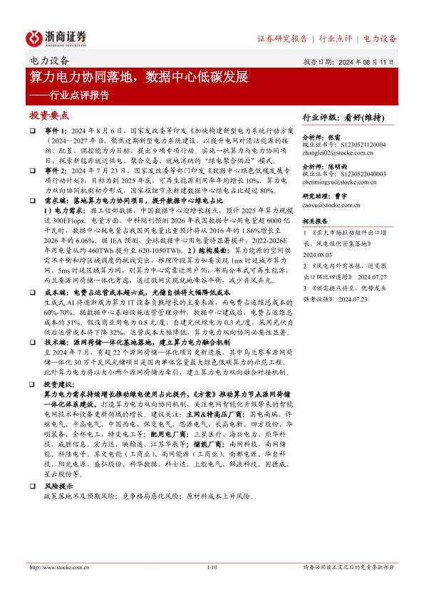 【浙商证券】【20240811】电力设备行业点评报告:算力电力协同落地,数据中心低碳发展-10页