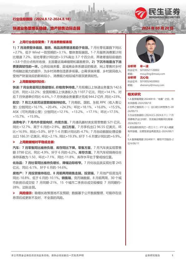 【民生证券】【20240820】行业信息跟踪:快递业务量增长稳健,地产销售边际走弱-24页